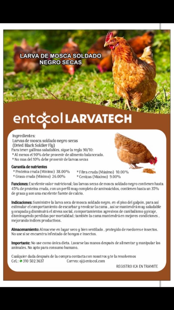 moreHoja con especificaciones del producto estrella de Entocol Larvatech para granjas avícolas.